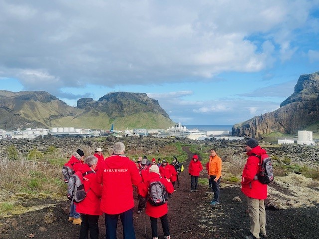 The trail started at the pier, with an easy set of signs and a map. After a short but sharp climb, we were at the first clifftop and so began a hike that offered view after view after view. We were walking away from the village so every vantage point gave us stunning views back to the village and our ship – Silversea Endeavour.