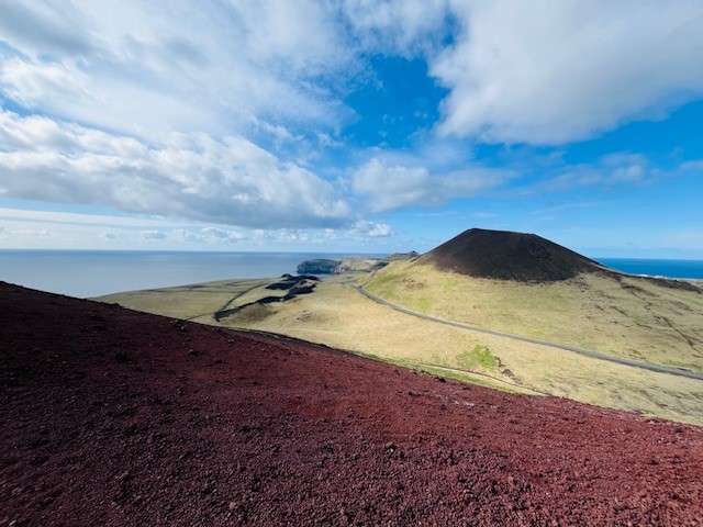 The hiking terrain quickly changed from grass and vegetation to red volcanic rubble. Every now and again little bits of vegetation were present, but it was pretty much barren. It really did feel like we were hiking on the moon. the trail switched back and forth up the side of the volcano and then trekked along the crests. Some parts were a little narrow, but I found that if I kept my head down and focussed on the path, the edges were less scary. Some readers may recall that I really don’t like hiking along cliff edges, it’s not the fear of heights, it’s the fear of falling… 🙂