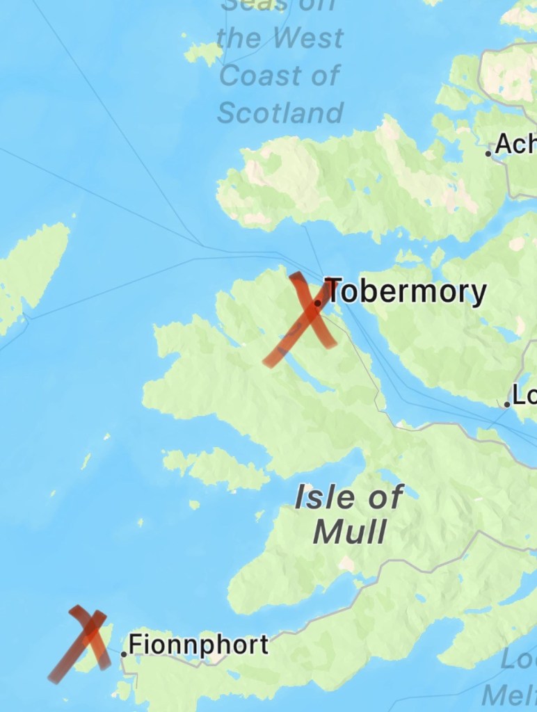 So, this is where I am. What I understand to be the Inner Hebrides, a cluster of islands off the west coast of Scotland. The two isles in question are Mull and Iona.