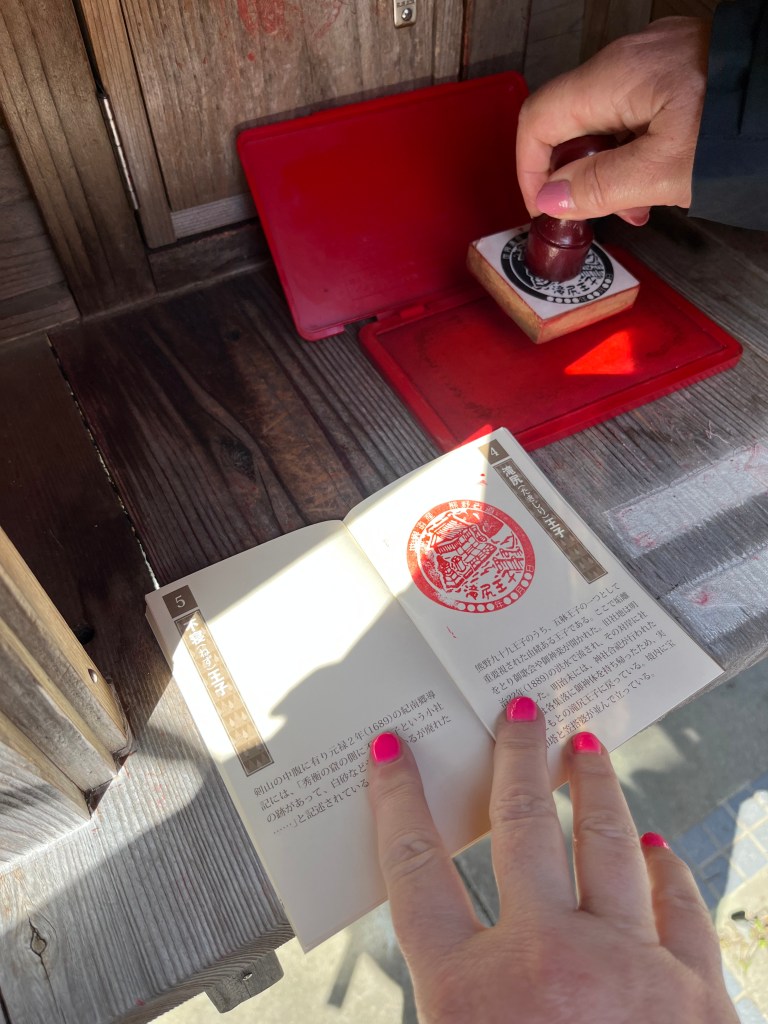 We devoured our bento boxes which were delicious, filling, nutritious and we couldn’t’ ask for anything better after hiking up a mountain for 2 hours. We stamped our books at the shrine and headed off. What books you ask? Well…