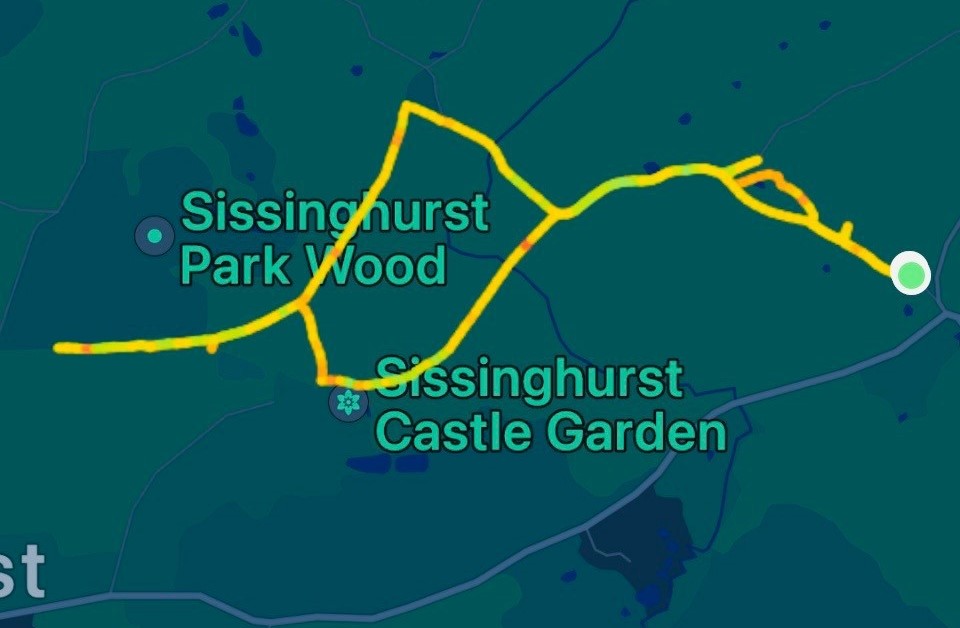 Even though I am used to farms and cattle, having two 600kg+ cows cantering up to you is a little intimidating! About now I realised I couldn’t see my exit point in the opposite hedgerow. Imagine this. I’m in a foreign field, with two huge cows tracking me like F18 Hornets, what’s my next move? I saw a gate. To the left. Which opened back onto the lane. Change of plan. Bessie and Biddy would have preferred I stay for a chat, but I had a hike to enjoy and it wasn’t going to end in a boggy field in Biddenden. Two minutes later I scaled a fence and was back out in the lane, a little sweaty and slightly defeated. You can see the loop at the start of my hike tracking pic. SIGH. I ventured down the adjacent lane to see if I could find the next stile, but no luck. Back to the original mission – my castle! The destination is important, but really, hiking is all about the journey.